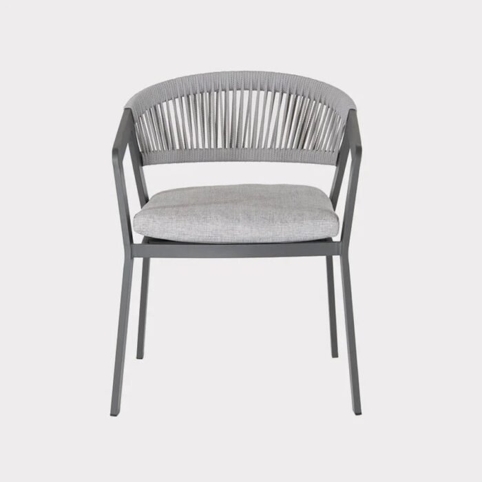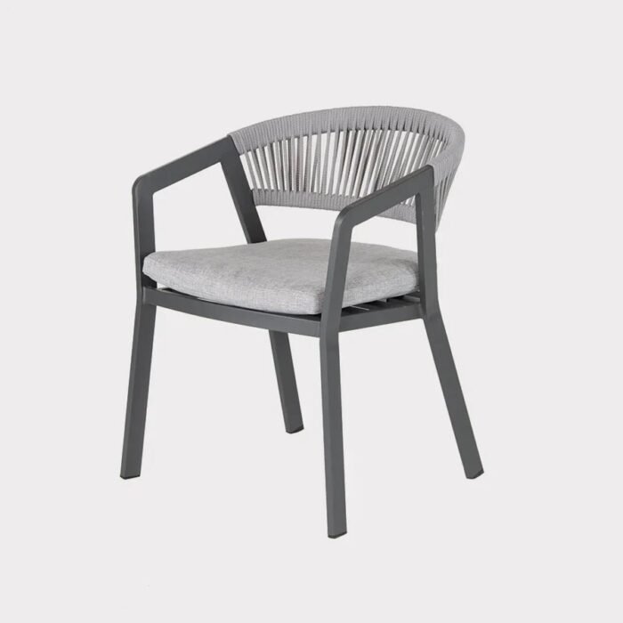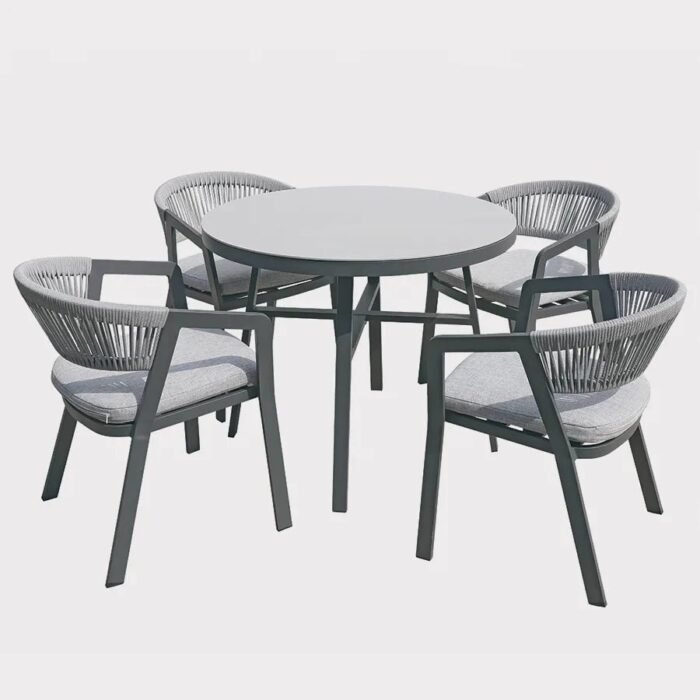 Material: Dining chairs are made with sturdy aluminium frame with PVC rope detailing. The dining table has an aluminium frame with grey finish glass top