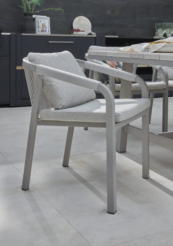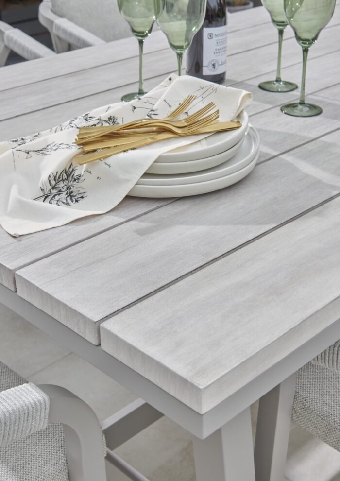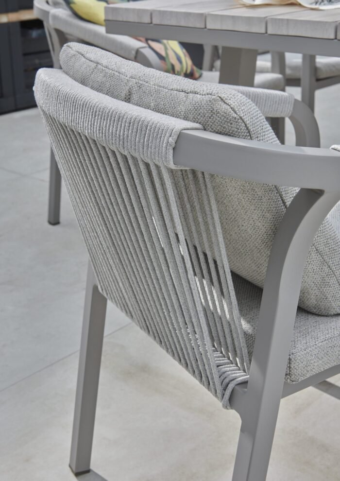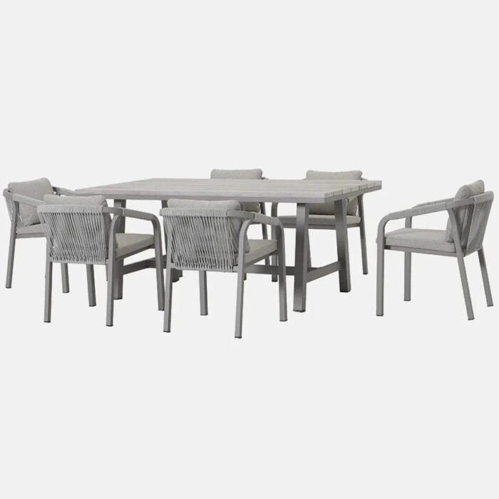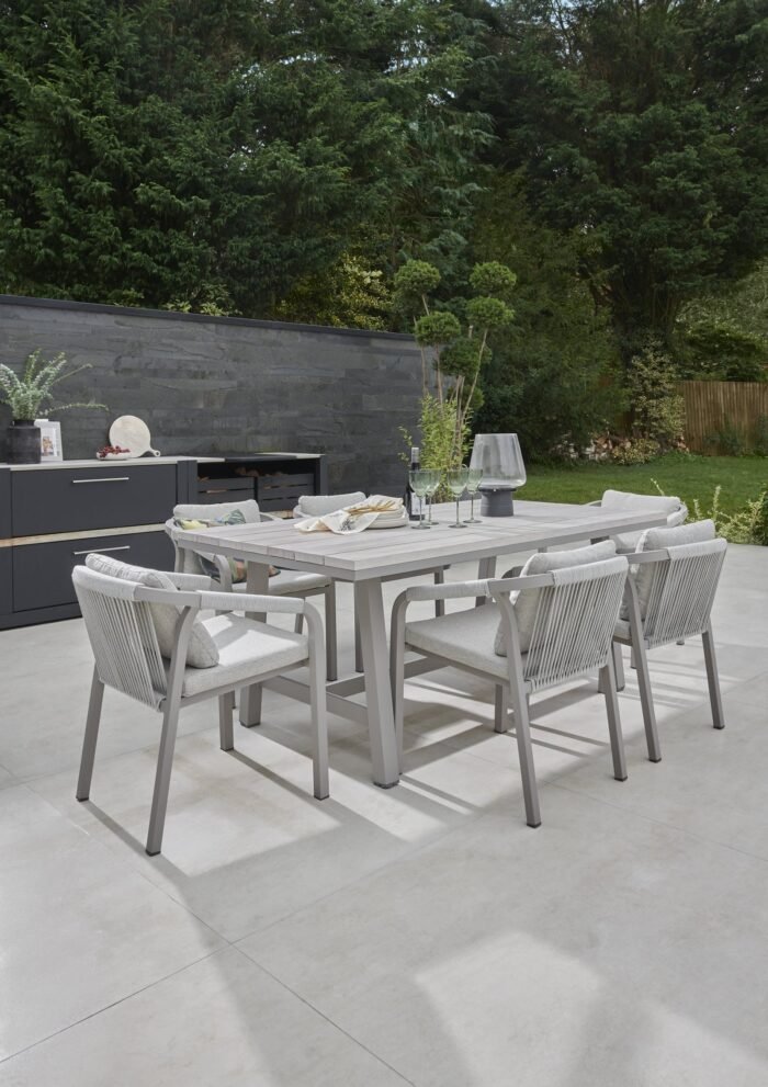 The Como 6-Seat Dining Set brings a fresh, stylish touch to your outdoor dining experience. Featuring a unique and distinctive new colourway, this set offers comfort and durability in equal measure. The set includes six dining chairs with plush seat pads and a spacious dining table, perfect for family meals or entertaining guests. The lightweight yet sturdy aluminium frame and polyester rope back ensure long-lasting quality, while the weatherproof cushions are ideal for outdoor use during the summer months.
