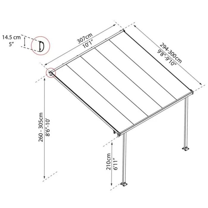 The Palram Canopia Feria Veranda is a stylish and elegant patio cover solution. Enjoy the outdoors all year round with the Feria Garden Canopy. The Feria is an aesthetic, maintenance free roofing solution allowing for various outdoor uses such as a patio cover and sun lounger. It features clean lines and detailed finishes that will compliment any house and will change your outdoor lounging habits.