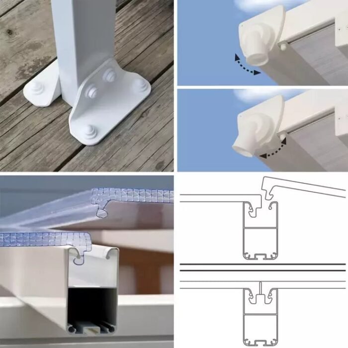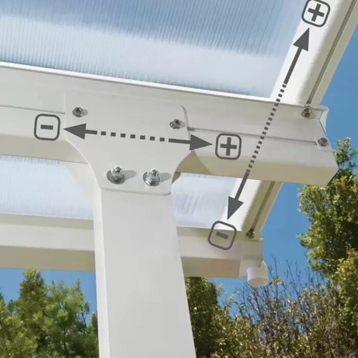 The Click-N-Lock system ensures that the assembly process is safe and simple, and requires no climbing for installation. It is ready to assembly and no specialised tools are required. The system locks the glazing between the structure rods and prevents water from penetrating the glazing. The built in guttering system collects the water on both sides of the patio cover, and gutter drain pipes can be attached in order to collect rain water for gardening and ponds.